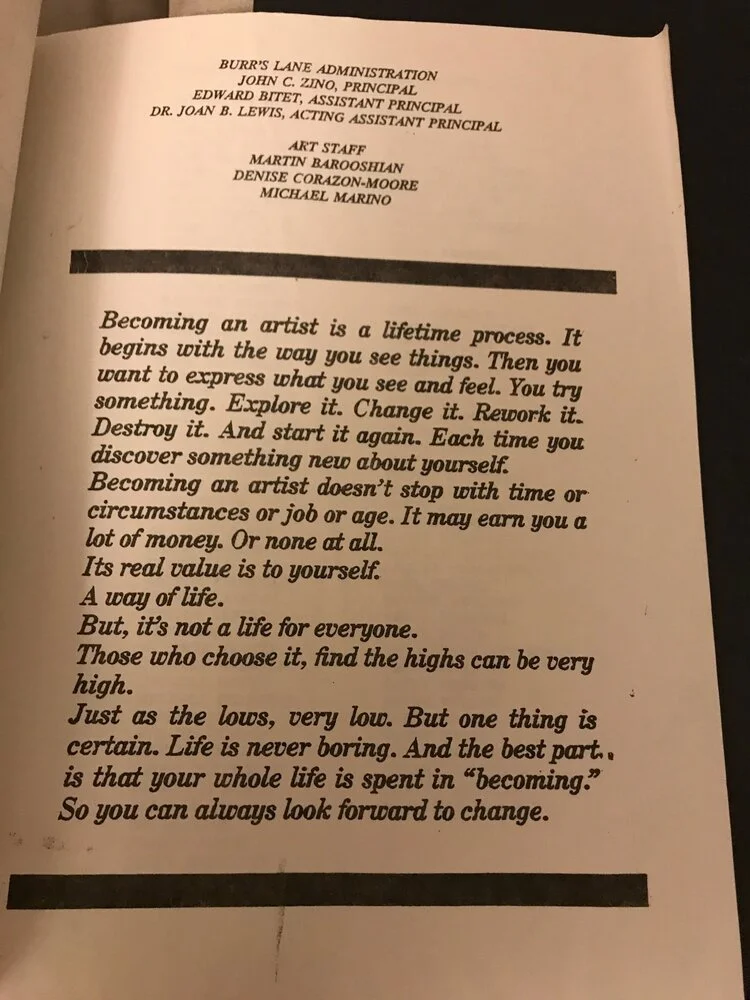 Ms. Corazon gave me the confidence to carve my own path. She understood the trials and tribulations of being an artist and I wouldn’t be teaching art today if I hadn’t been graced by her presence. I guess the point of me telling you all of this at this very moment in time, is because I, like most of you, have had a lot of time to reflect about who I am, why I am doing what I am doing and where it all came from. I credit my parents for being huge advocates for the arts and always modeling the meditative importance of finding a creative outlet. But I’ve also experienced the impact of a great teacher and I am filled with gratitude for that experience and the inspiration that came from being one of the lucky ones to learn from Ms. Corazon.