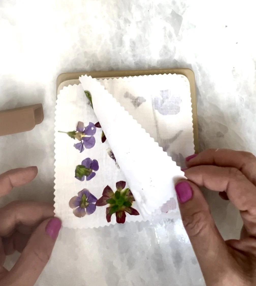 Heat press or iron: The heat press or iron method is a good option when you're on the go. You will place the flowers between two pieces of absorbent papers and press with heat in 10-15 second increments. As you work, you will see moisture in the form of either dripping or steaming occur. You will continue to press until no more moisture escapes. With both the heat press and the microwave press, you will sacrifice a small amount of pigment retention since this method takes some of the color. In my experience, it isn't really enough for me to notice. Both heat methods are good candidates when you are in a rush.