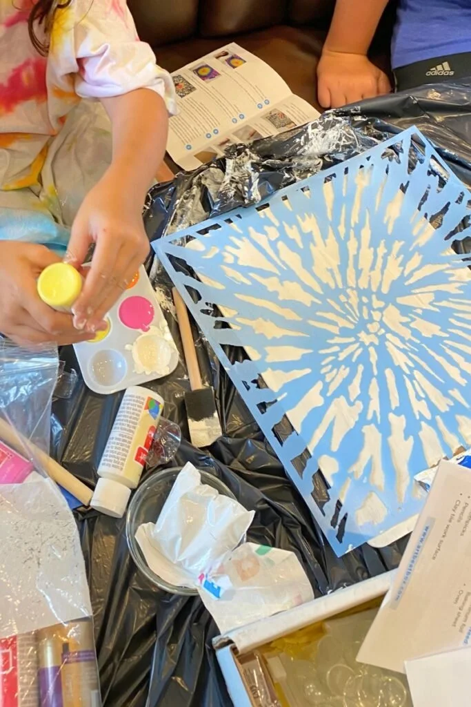 4. Attach the stencil or design template: Place your stencil onto the clipboard and secure it with painter's tape or any removable adhesive. Make sure it's firmly attached and there are no gaps between the stencil and the clipboard. If you'd prefer to use your own design elements library, you can do that, too. But I prefer the reusable stencils found online or at your local hardware store. Real people (artists) have their own design library to work with, but to save time I used the tie dye stencil because I wanted to make the classic multicolored tie dye background. But you can totally do one color or just two.